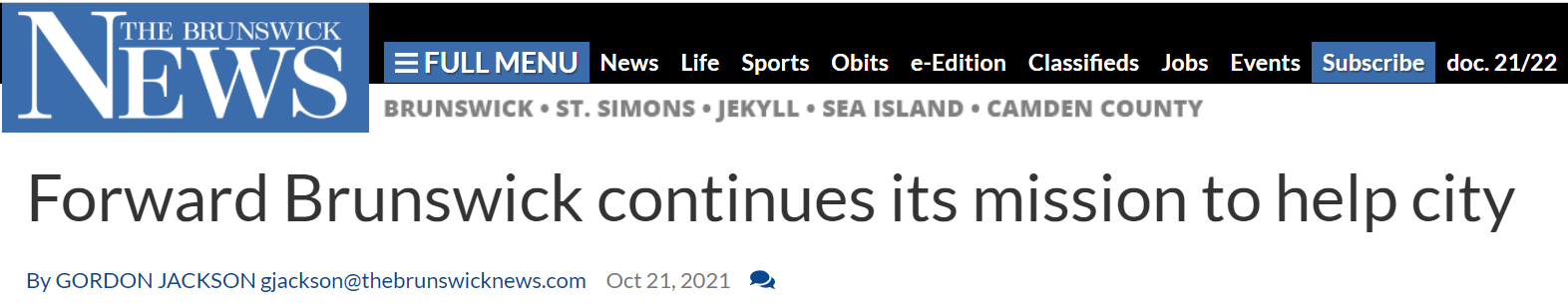 Forward Brunswick has completed a 90-day facilitated strategic planning process.  Its mission is to inspire community commitment and raise resources to accomplish Brunswick revitalization projects.  Its vision is to foster economic vitality as Brunswick’s community partnership leader.  There are three focus areas that will improve quality of life for Brunswick’s residents, visitors, and stakeholders: Amenities, Beautification, and Development.  Read the full Brunswick News front page article here.